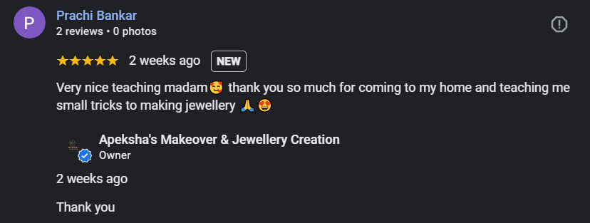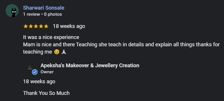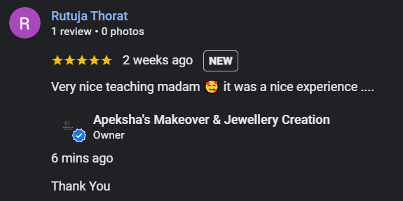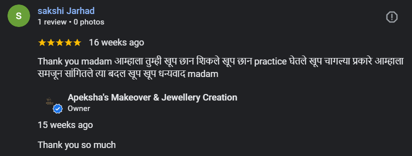 “Apeksha’s Makeover & Jewellery Creations हे सौंदर्य, कला आणि सर्जनशीलतेचे एक परिपूर्ण केंद्र आहे. 1 जानेवारी 2024 रोजी सुरू झालेला हा व्यवसाय प्रत्येक स्त्रीच्या सौंदर्याला नवा आत्मविश्वास आणि वेगळी ओळख देण्याच्या उद्देशाने कार्यरत आहे” Read More....