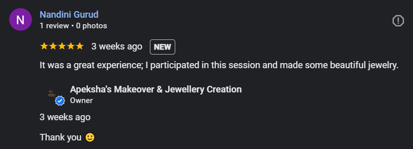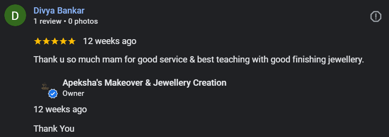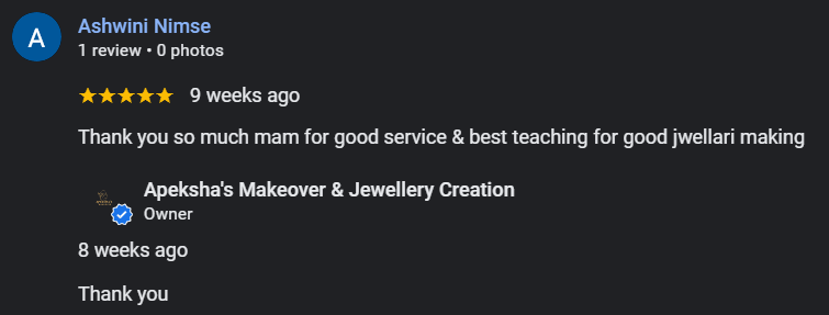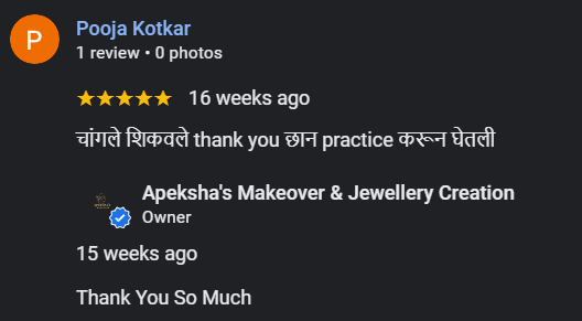 याशिवाय, अपेक्षा मेकऒव्हर & ज्वेलरी क्रिएशन येथे आम्ही Professional Jewellery Making Classes देखील घेतो. या क्लासेसमधून शिकणाऱ्यांना Basic ते Advanced Jewellery Making, Practical Training तसेच स्वतःचा ज्वेलरी व्यवसाय सुरू करण्यासाठी आवश्यक मार्गदर्शन दिले जाते. आमचे ध्येय केवळ शिकवणे नसून, महिलांना स्वावलंबी आणि आत्मनिर्भर बनवणे आहे.